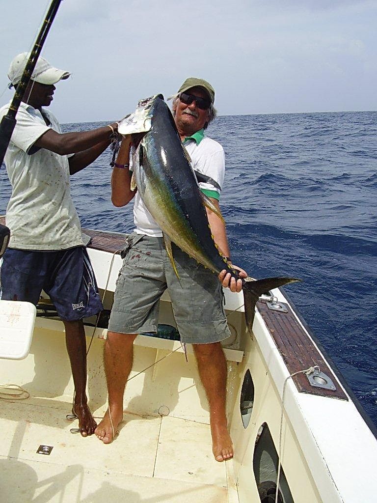Tega is a 33ft Aqua bell Hull armed with Twin Perkins diesel engines and capable of 27 knots. She is fully rigged for Big Game Trolling and Bottom fishing. Steve used to run a channel wreck fishing charter from southern England so he really knows his stuff about bottom fishing. This is his third year in Kenya and amongst other angling disciplines he is fast building a reputation as a Major Marlin. To complement the skipper Tega carries a crew of three “deckies”, Sunday, Tabu and Julius the trainee. These numbers are important when running a spread of nine or ten lures as multiple hook-ups and the resulting chaos are common.