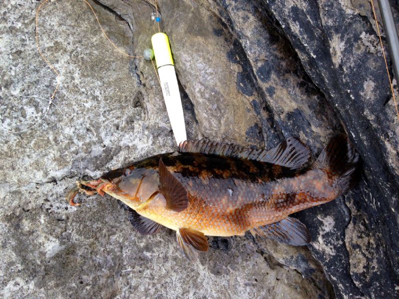 We tried our best on one of the well-known rock marks, enjoying the hard fighting Wrasse and the nervous excitement felt while fishing on such precarious marks, landing fish after fish on our pike rods and cigar float setup, but alas the specimen fish eluded us. However I did lose a bigger fish trying to hoist it up the rocks, my line must have suffered a nick on the barnacle encrusted rocks prior to hooking it and the weight of the fish found the flaw and it slipped back into the wash. Shortly after this a big wave crashed off the rocks, soaking us both from head to toe! We took this as a sign that it was time to leave, if we had left it any later, and with the rising tide, such a wave could easily have swept us in. Soaked but happy it was a session to remember.