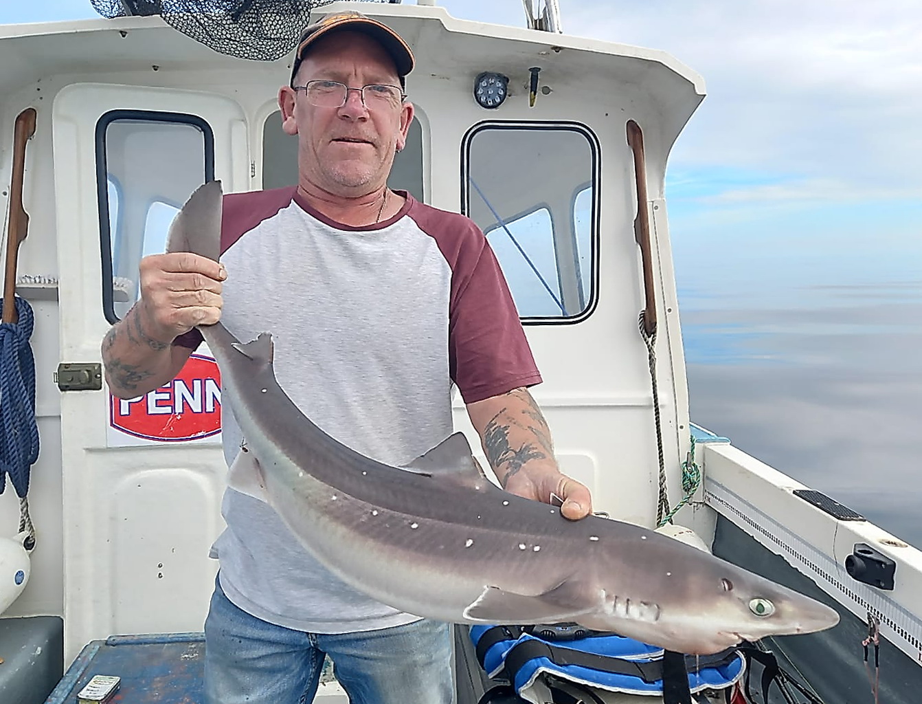 Michael then hooked into something obviously larger and packing a bit of power, skilfully coaxing it to the surface on a light rod and Mackerel rig. A sleek Tope around the twenty five pound size, unfortunately biting through the short hook-length just as I reached to tail it. This would have been Michael's first ever Tope, had we had a bit of luck behind us, but never mind. It showed us exactly what is about down there. One of my goals for 2024 is to put Michael over some decent Tope fishing for a trophy shot, and scratch that particular itch that he has!
