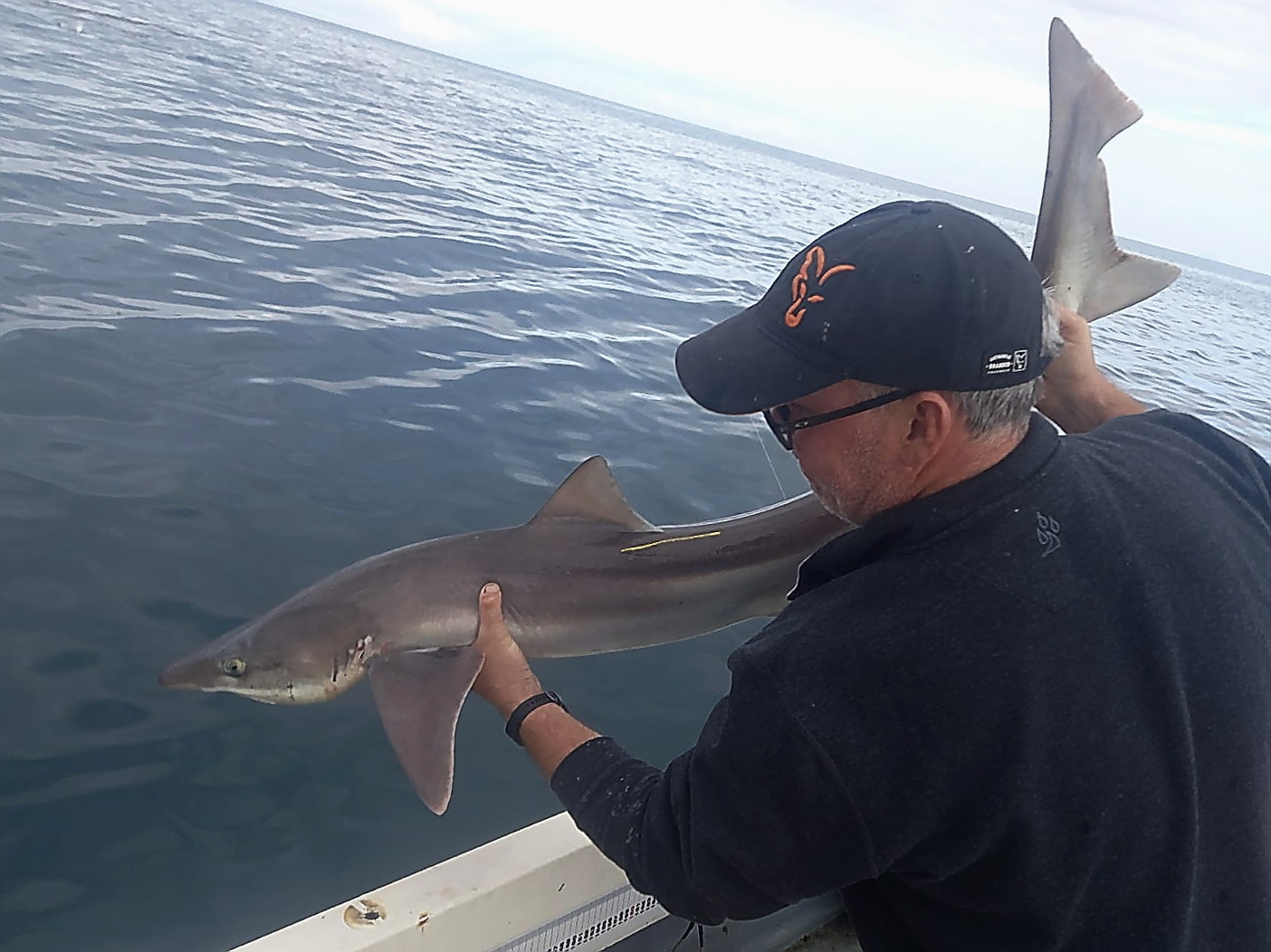 At this stage, I was still in Pollock-Cuckoo Wrasse mode, fixated on chasing down an Irish Specimen of either, but Glenn made the correct choice and instantly switched to a Tope rig, great call. Simple running ledger, twenty inches of wire biting trace, 8/0 bronze O'Shaughnessy Hook, and juicy Mackerel "Flapper" to tempt them. Over the course of the ebb tide, he managed to hook and land five, one over the statutory Specimen size of 1.55 metres in length.